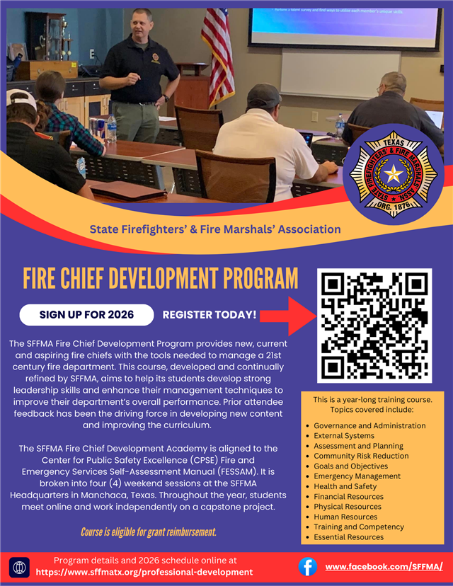 Our 2026 Fire Chief Development and Managing Officers’ Programs are now open for 2026 registration! Learn more about the SFFMA Professional Development courses on our website. |
