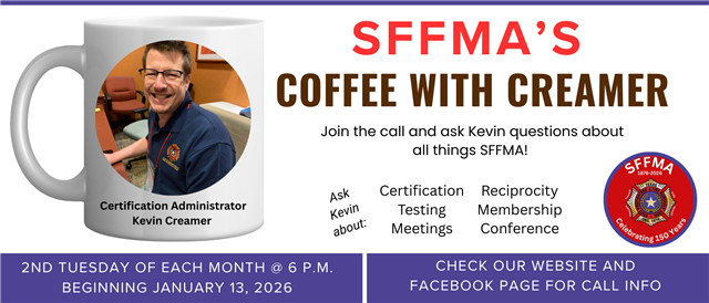 Beginning January 13, we're launching "Coffee with Creamer" - a live Q&A session with Kevin Creamer. He'll answer your questions about membership, certification, reciprocity and anything else you'd like to know about SFFMA! Check our FB page and website for details about how to join the call.