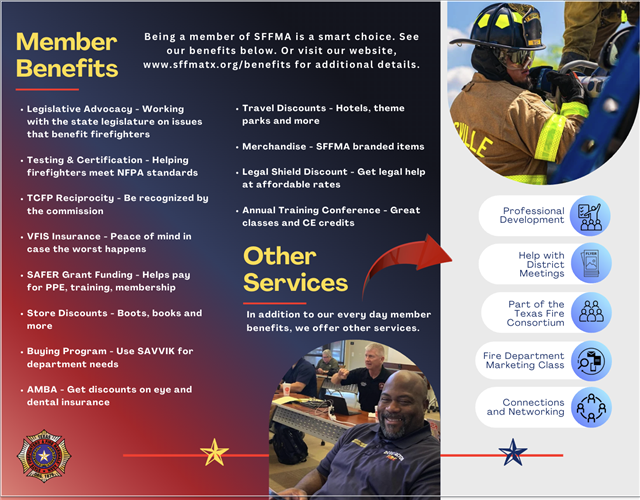 Membership is SFFMA is affordable but more importantly, the benefits are many. And we are here to help all Texas firefighters, including those who work or volunteer for ESDs. |