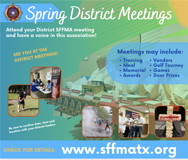 Each spring and fall, SFFMA districts across Texas host meetings. Attending provides an excellent opportunity to stay current on fire service issues, hear what's happening with SFFMA, meet executive board members, talk with vendors, and network with other firefighters. Many meetings offer training classes as well as elections, memorials, and games. Not to mention a meal! Check with your local district leaders on costs. And bring a friend (or three) from a neighboring department! Let's work to engage all fire departments across the state. Check our website for district meeting info. Attend district meetings and make sure your voice is heard!
