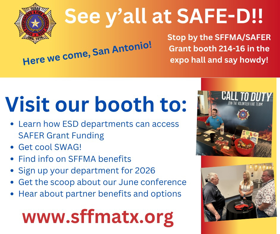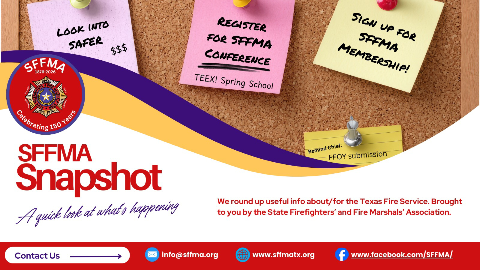 Welcome to SFFMA Snapshot, where we share short bits of useful info. Look for this only twice a month, so we're not flooding your inbox! It's news you can use and is relevant to Texas firefighters. Enjoy! |