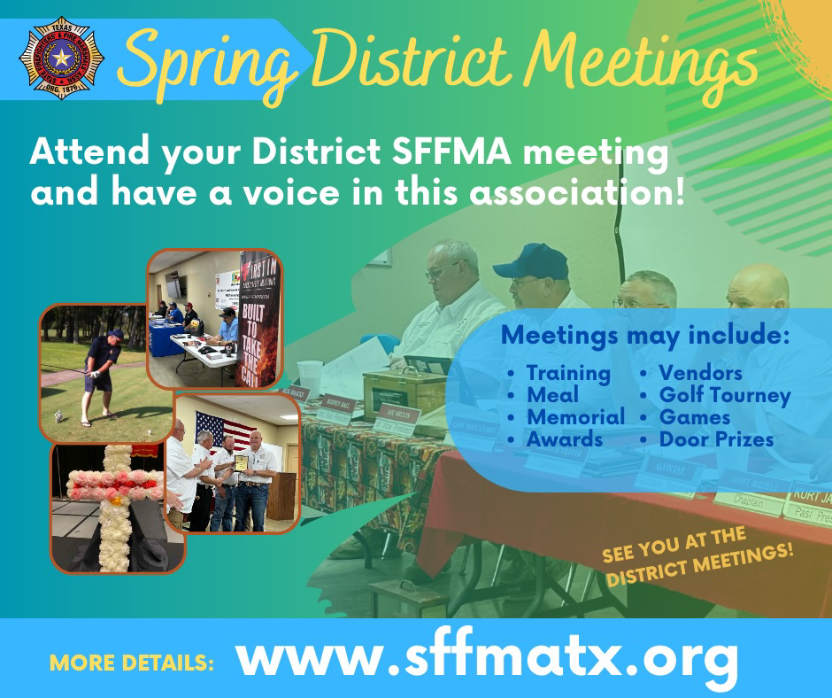 Each spring and fall, SFFMA districts across Texas host meetings. Attending provides an excellent opportunity to stay current on fire service issues, hear what's happening with SFFMA, meet executive board members, talk with vendors, and network with other firefighters.