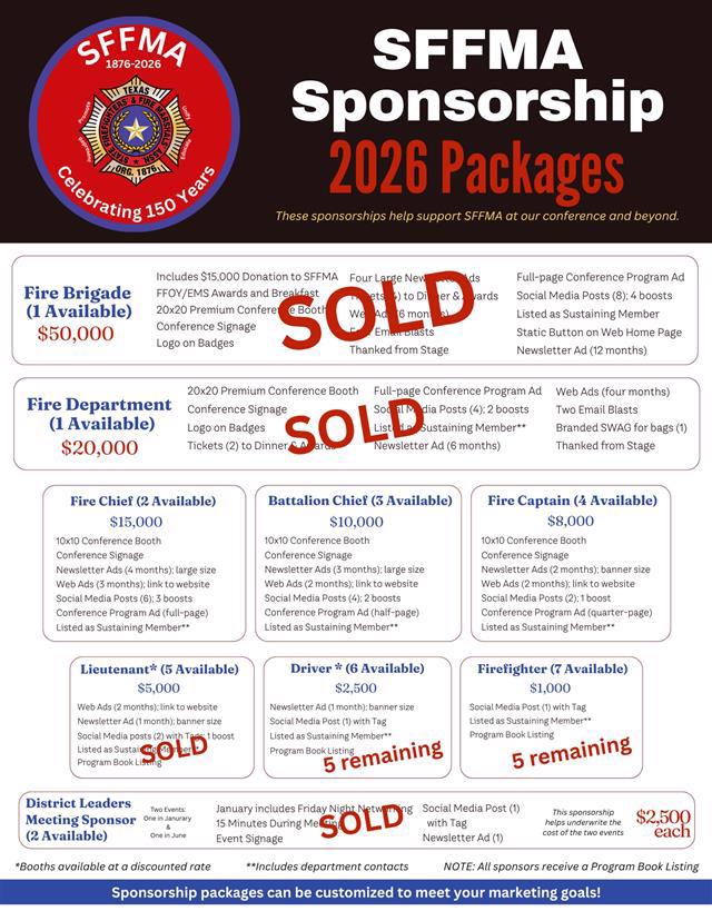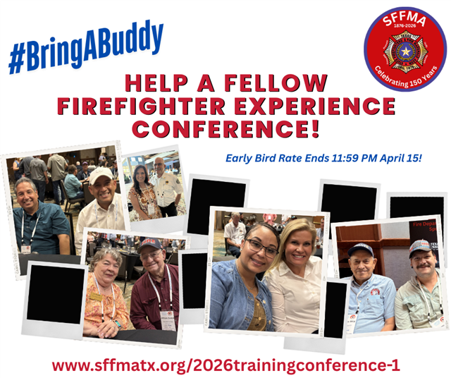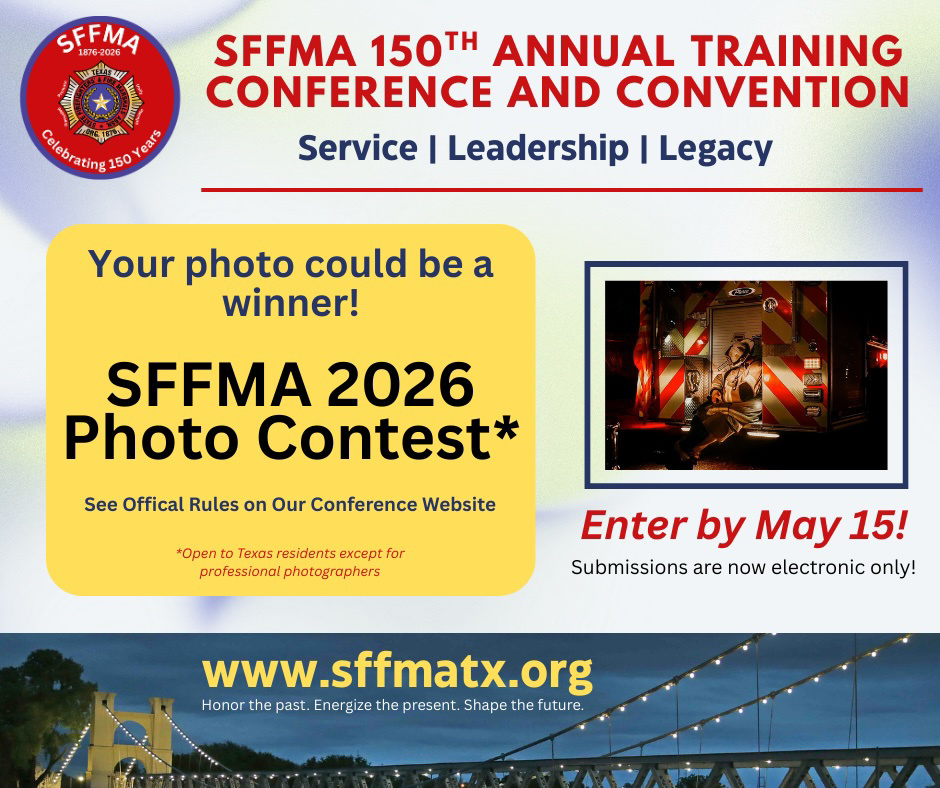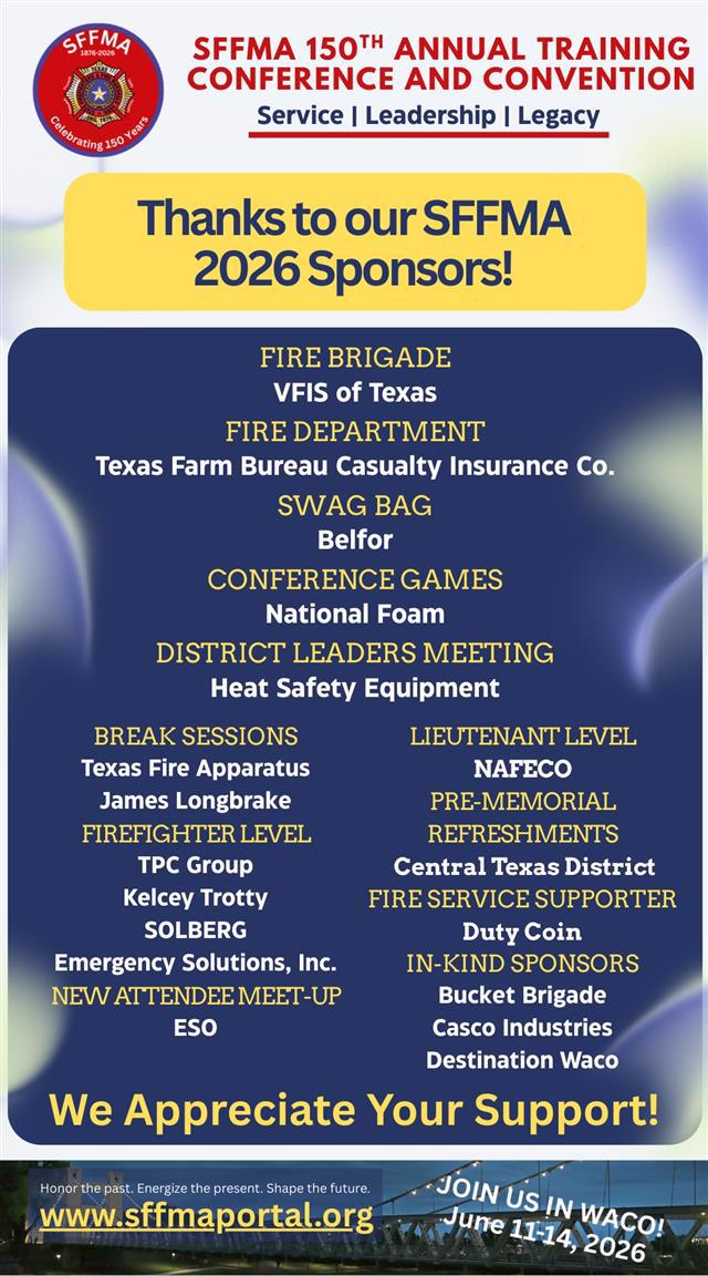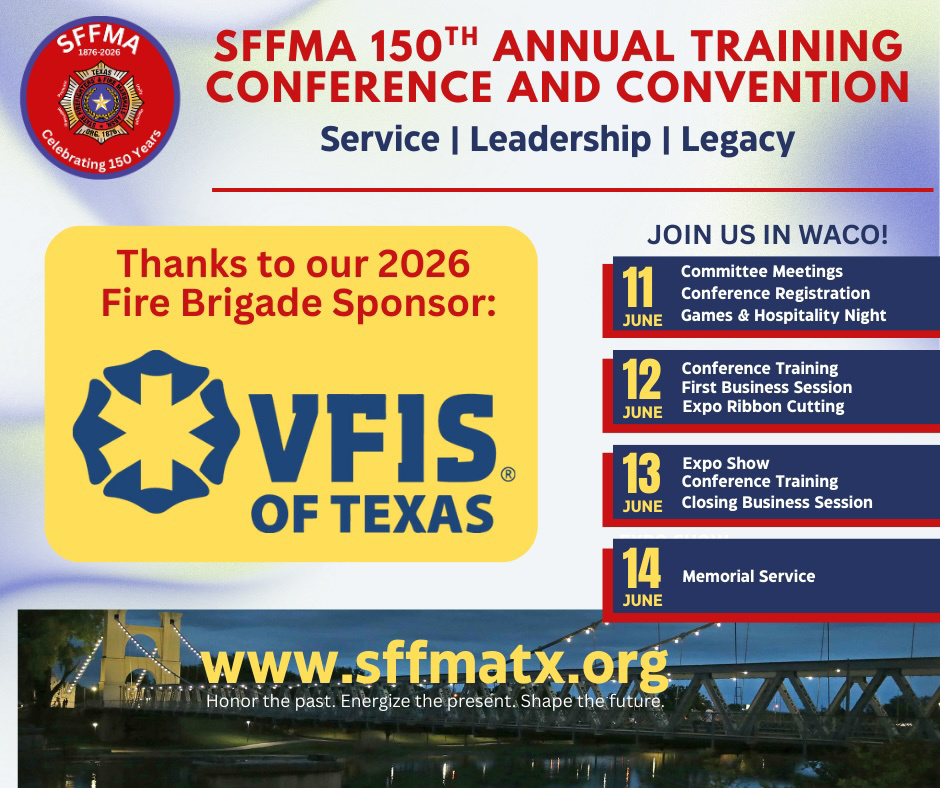 Special thanks to VFIS of Texas for being our 2026 Fire Brigade Sponsor! We are deeply appreciative of their continued support. SFFMA is also immensely grateful for the continued support from Texas Farm Bureau Casualty Insurance, our Fire Department sponsor. Many thanks to all of our 2026 sponsors! See all of them here.