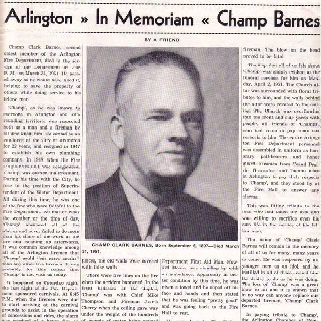Firefighter Champ Clark Barnes, an Arlington firefighter, died on March 31, 1951, at age 54 while working at the scene of a fire in a residential duplex after a ceiling collapsed on him. He was removed from the rubble and tended to by first aid firefighters. While he initially said he felt fine, he later died from his injuries sustained during the collapse.